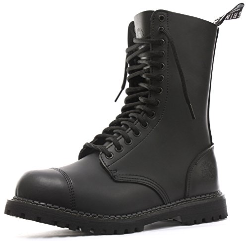 NEW UPDATED 2015 VERSION!!! Grinders were established in 1965 and have since become one of the leading "Street Fashion Footwear" brands from the United Kingdom. Designed by some of the best craftsmen in England, Grinders are renowned for the amazing footwear they produce and welted sole footwear. The sole unit, which is patented to Grinders, is heat sealed to the welt, giving the Grinder footwear range the strength and lasting durability of the Goodyear welt process. The unique air cushion sole enables flexibility and ensures guaranteed long lasting quality to every pair. These Grinders Herald Black ranger boots come from a long British heritage of "ranger" boots. The boots worn by British rangers share the design features of the famous jump boots worn by U.S. paratroopers. This is the new updated 2015 version! These hard wearing and comfortable boots feature an all black smooth matte finish tough leather upper for durability and abrasion resistance with heat embossed branding on the outer side and a 14 eyelet lace fastening system for a secure fit. Also featured is an internal steel toe cap, a removable padded insole for comfort, and a branded chunky oil resistant rubber commando sole. The goodyear welted rubber soles delivers long lasting wear. The strong branded pull loop on the heel makes the boots easier to put on.